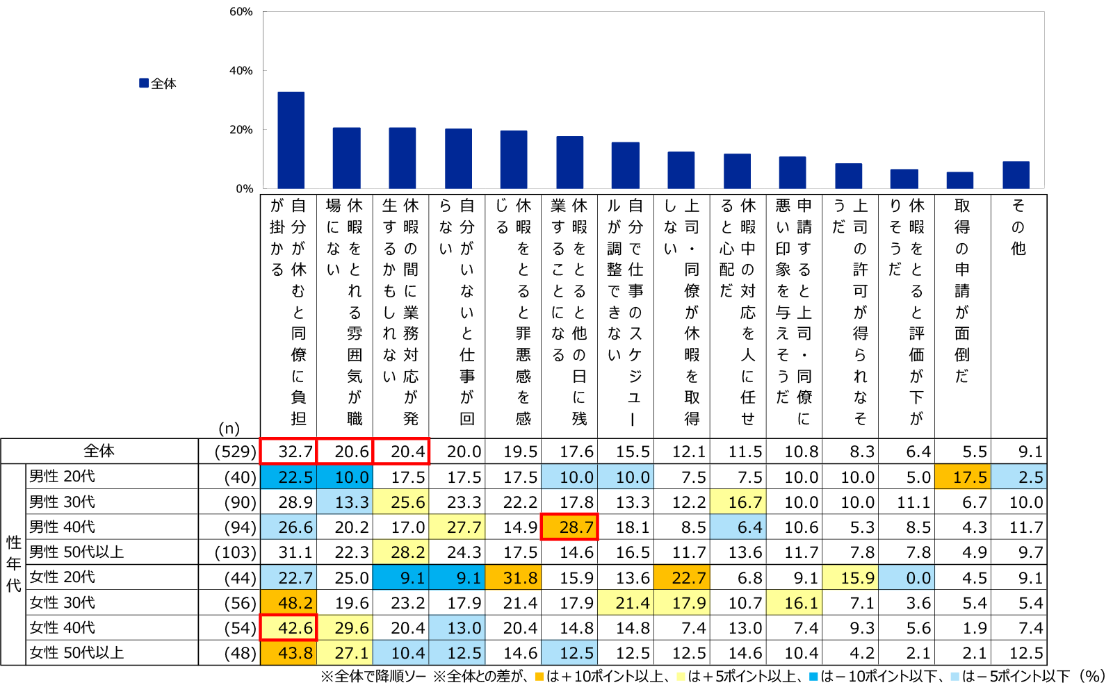2日以上連続の有給休暇を取得しにくい理由としては、「自分が休むと同僚に負担がかかるから」が32.7%と最も多く、特に30代以上の女性で顕著だった。