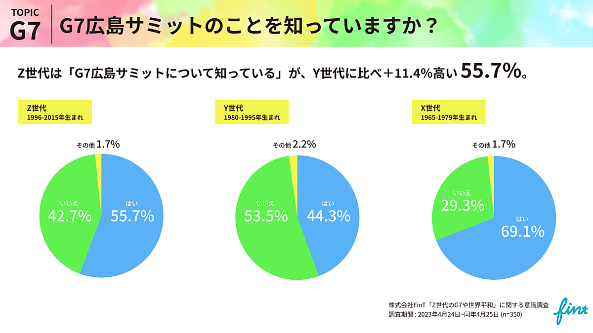 この調査ではZ世代(1996年~2015年生まれ)、Y世代(1980年~1995年生まれ)、X世代(1965年~1979年生まれ)の3世代を比較している。まず「G7広島サミットのことを知っていますか?」と聞くと、Z世代が55.7%、Y世代が44.3%、X世代が69.1%と、Y世代よりZ世代のほうが高かった。