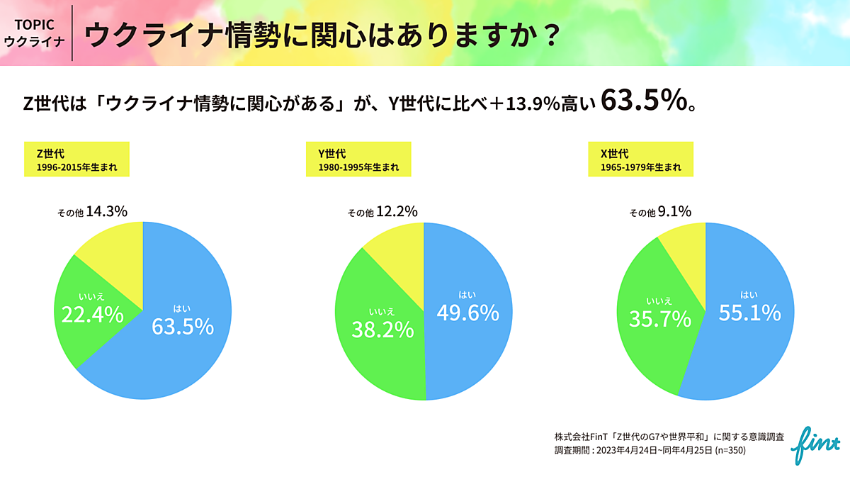 「ウクライナ情勢に関心はありますか?」では、Z世代が63.5%、Y世代が49.6%、X世代が55.1%と、Z世代が最も高い。