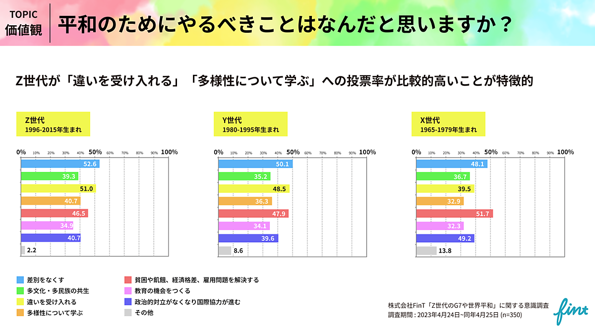 これに先立ちFinTは5月11日に、Z世代に世界平和やG7を身近に感じてもらうイベント「Think for Lasting Peace with Generation Z」を開催。歌手のAI氏とFinT代表取締役の大槻祐依氏がトークセッションを行った他、Z世代350人、Y世代350人、X世代350人(計1,050人)を対象に実施した「世界平和に関する意識調査」の結果を公開した。