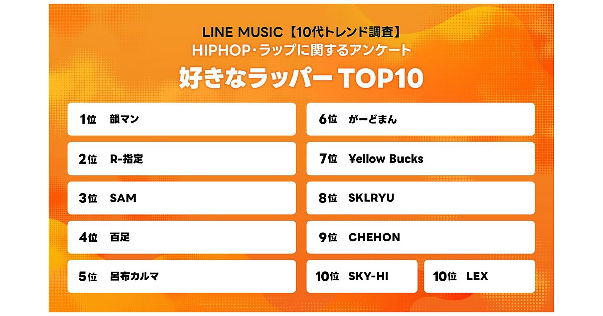 LINE MUSICは、HIPHOP・ラップに関するトレンド調査の結果、および邦楽HIPHOPジャンルのランキングを発表した。10代男女1,295人が回答している。