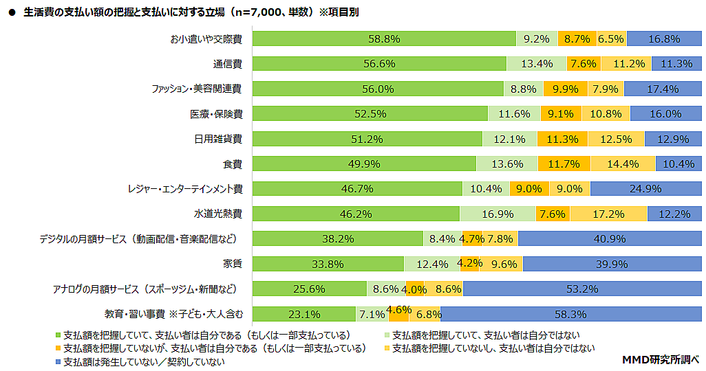 まずこれらの把握と支払い立場について聞くと、「支払額を把握していて、支払い者は自分である(もしくは一部支払っている)」がもっとも多かったのは「お小遣いや交際費」58.8%。以下「通信費」56.6%、「ファッション・美容関連費」56.0%が続いた。