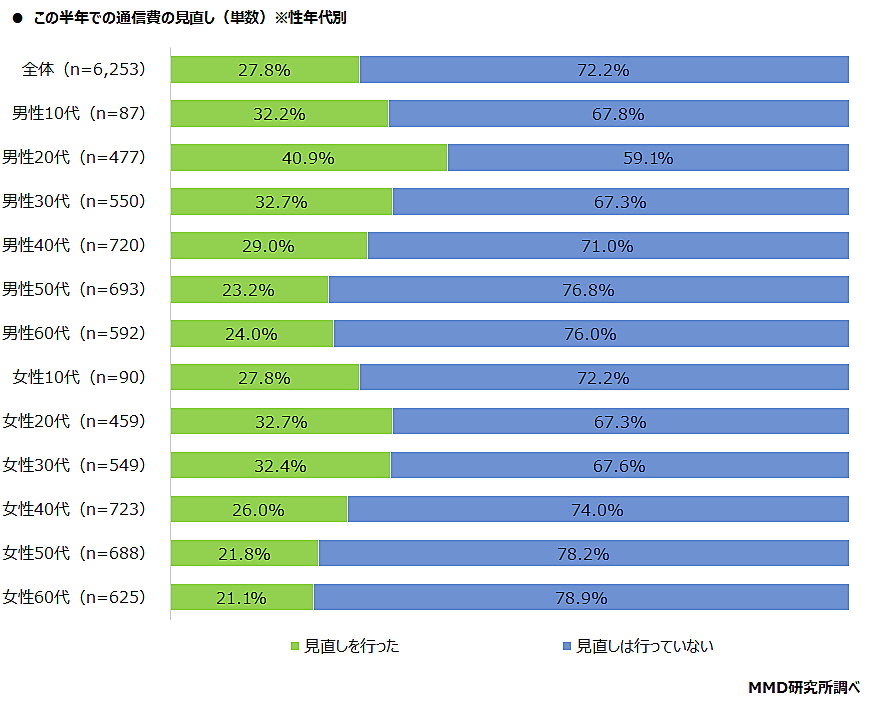 ここから「(スマホなどの)通信費」に絞り質問。通信費を使う6,253人にまず「この半年で通信費の見直しをしたか」を聞くと、「見直しを行った」27.8%、「見直しは行っていない」72.2%となった。性年代別では男性20代が最も多く、女性20代がそれに続く。