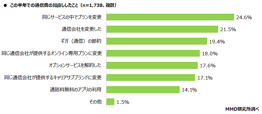 「見直しを行った」と回答した1,738人に、「見直しした内容」(複数回答可)を聞くと、「同じサービスのなかでプランを変更」24.6%が最多で、「通信会社を変更した」21.5%、「ギガ(通信)の節約」19.4%がそれに続いた。