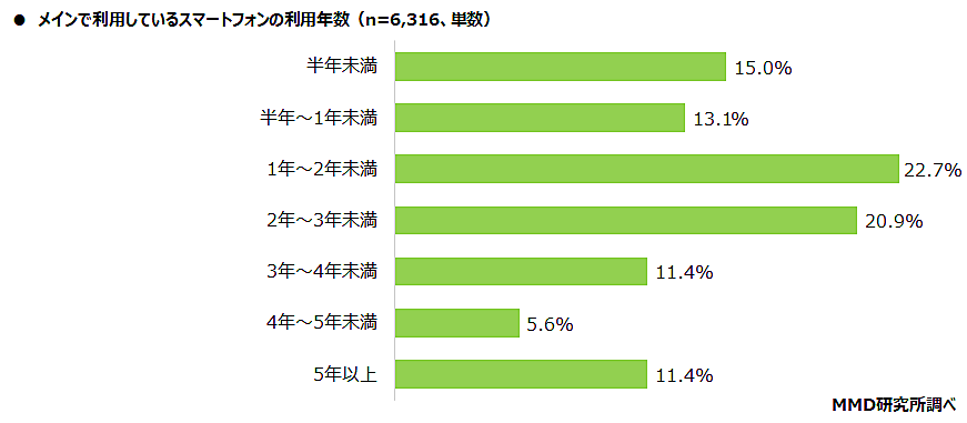 一方でスマートフォンを所有する6,316人に、「メインで利用しているスマートフォンの利用年数」を聞くと、「1年~2年未満」22.7%が最多で、「2年~3年未満」20.9%、「半年未満」15.0%と、短期間でスマホを乗り換えていることが判明。「5年以上」は11.4%にとどまった。