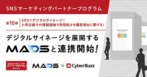 ソーシャルメディアマーケティング事業のサイバー・バズは、同社が展開するSNSマーケティングの活性化・広告効果改善支援を行うプログラム「サイバー・バズSNSマーケティングパートナープログラム」で、デジタルOOH(屋外広告)広告ネットワーク事業のMADSとの連携を始める、と5月29日発表した。SNSと同社のデジタルサイネージを組み合わせて購買増を図る。