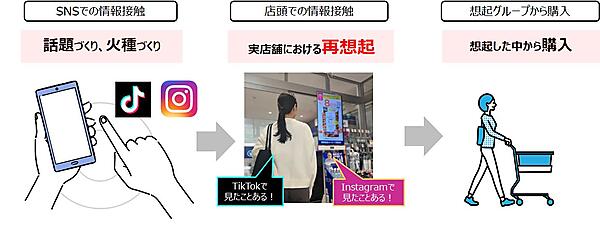 MADSとの連携はSNSマーケティングパートナープログラムの第10弾。独自の広告メニューを開発した。SNSの投稿内容を活用したクリエイティブを小売店のデジタルサイネージで配信し、購買直前の認知による非計画購買を促すことで購買増加につなげる。SNSでの認知・興味喚起が一般化する中、店舗のサイネージで「SNSで見たことがある」と思い起こしてもらう。
