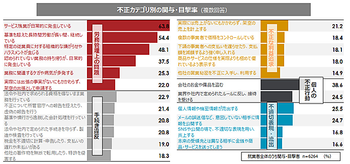 具体的な内容では、「日常的なサービス残業」「基準を超える長時間労働」「組織的な嫌がらせやハラスメント」など労務管理上の問題が特に多い。一方で「個人情報や機密情報の流出」「資格を得ないまま業務を行っている」といった問題も一定数存在する。