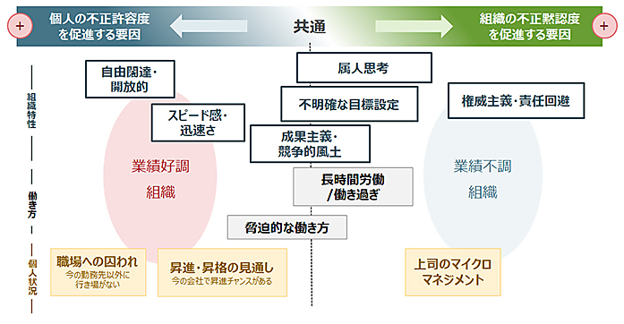 こうした不正発生のリスクを高める要因を分析すると、業績が好調だと「個人の不正許容度(個人が不正しても許される、不正は必要悪だと感じる意識)」が高くなり、業績が不調だと「組織の不正黙認度(勤務先の会社は不正・不祥事が起きても対処せず、隠ぺいするだろうという意識)」が高くなる。そのため、業績はほぼ関係ないく、不明確な目標設定や成果主義・競争的な風土が不正発生のリスクを高めていた。