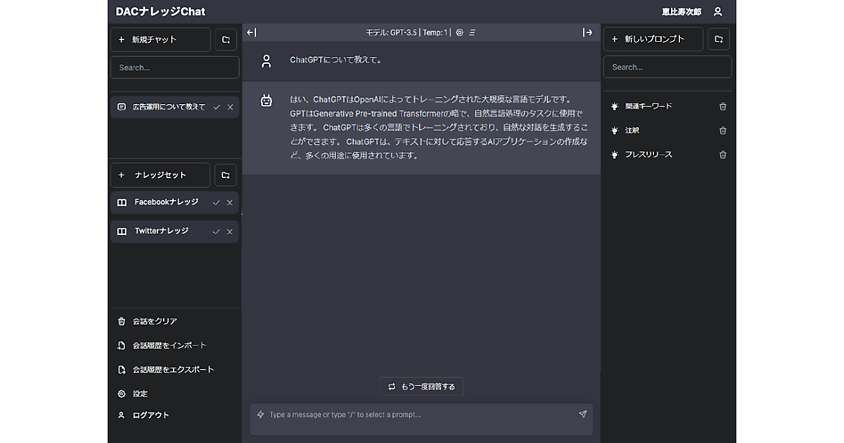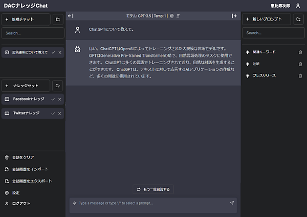 このAIソリューションは、ChatGPTに搭載の大規模言語モデル「GPT-3.5」と最新版「GPT-4」に対応。「Facebook」「Google」「LINE」「Twitter」などでのDAC独自の広告運用の知見を生かした。プロンプトの履歴管理、プロンプトテンプレートの社内共有と評価、個人情報や機密情報の検知と外部送信中止の各機能がある。ChatGPT以外の生成AIへの対応も予定する。