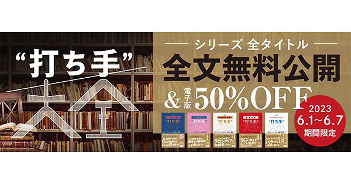 インプレスは、「“打ち手”大全」シリーズ特設ページの公開と『ネット広告運用“打ち手”大全』の重版出来を記念して、2023年6月1日(木)~6月7日(水)の1週間限定で、同シリーズの書籍5タイトルの全文を無料公開するキャンペーンを実施する。また、直販サイト「インプレスブックス」にて、電子書籍版を50%OFFで販売する。