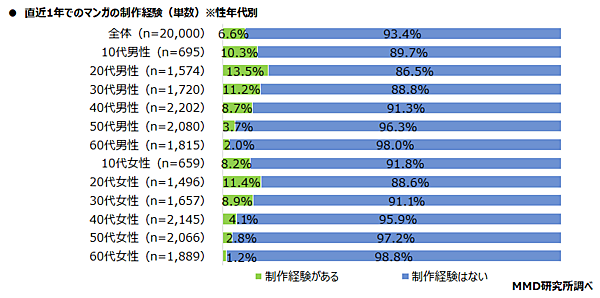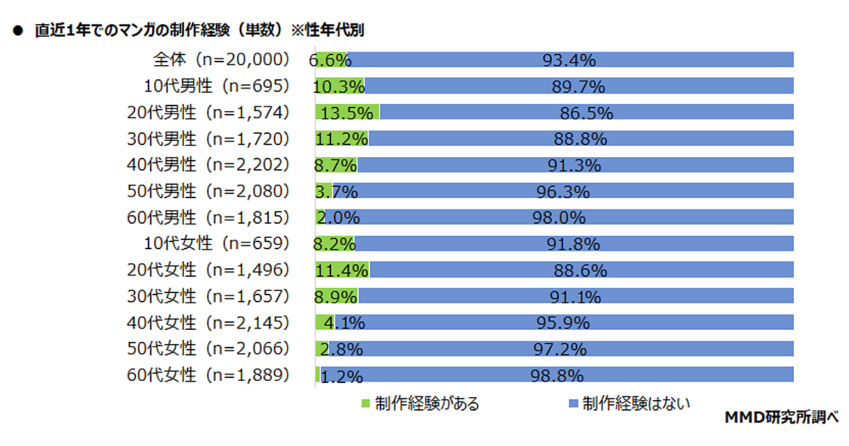 まず20,000人を対象に「直近1年でのマンガ制作経験」を聞くと、「制作経験がある」は6.6%。性年代別では20代男性(n=1,574)13.5%、20代女性(n=1,496)11.4%、30代男性(n=1,720)11.2%が上位だ。