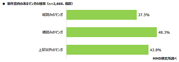 「今後、漫画の制作意向があるか」では「ある」は13.3%。今後マンガの制作意向があると回答した2,666人に「制作意向のあるマンガの種類」を聞くと、「縦読みのマンガ」37.5%、「横読みのマンガ」48.3%で、横読みのほうがかなり多い。