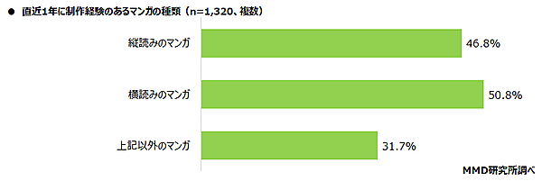 一方、直近1年でマンガ制作経験があると回答した1,320人に、「直近1年に制作経験のあるマンガの種類」を聞くと、「縦読みのマンガ」46.8%、「横読みのマンガ」50.8%でわずかに横読みが上回った。