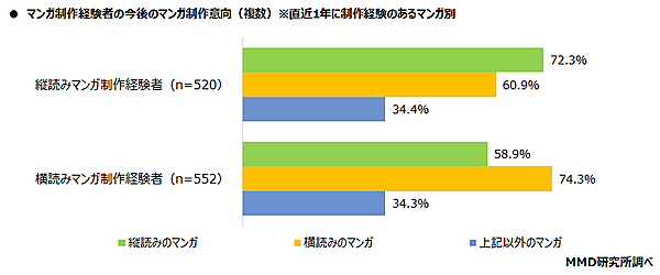 これを、縦読みのマンガ制作経験者(n=520)に聞くと「縦読みのマンガ」が72.3%だが、横読みのマンガ制作経験者(n=552)に聞くと「横読みのマンガ」74.3%で、横読み派のほうが高い制作意向を示した。