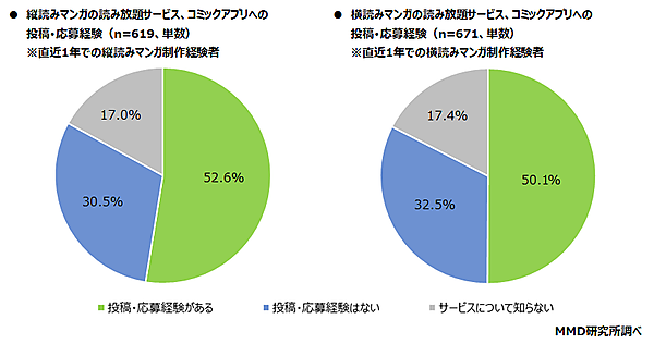 直近1年に縦読みマンガの制作経験がある619人、横読みマンガの制作経験がある671人を対象に、「縦読み・横読みマンガの読み放題サービス、コミックアプリへの投稿・応募経験」を聞くと、「縦読みマンガの読み放題サービス、コミックアプリへの投稿・応募経験」は52.6%、「横読みマンガの読み放題サービス、コミックアプリへの投稿・応募経験」は50.1%でわずかに縦読みが上回る。