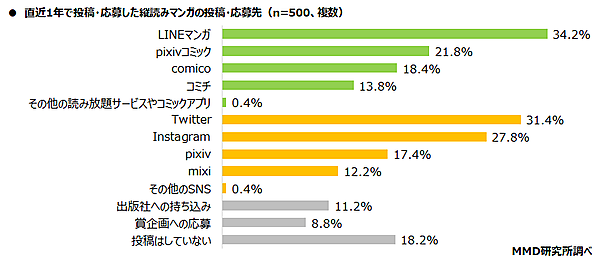 なお直近1年に縦読みのマンガ制作経験のある500人を対象に「直近1年で投稿・応募した縦読みマンガの投稿・応募先」を聞くと、「LINEマンガ」34.2%、「pixivコミック」21.8%、「comico」18.4%が上位だった。
