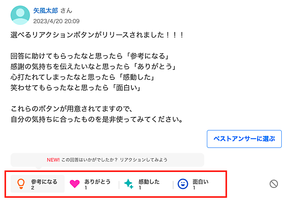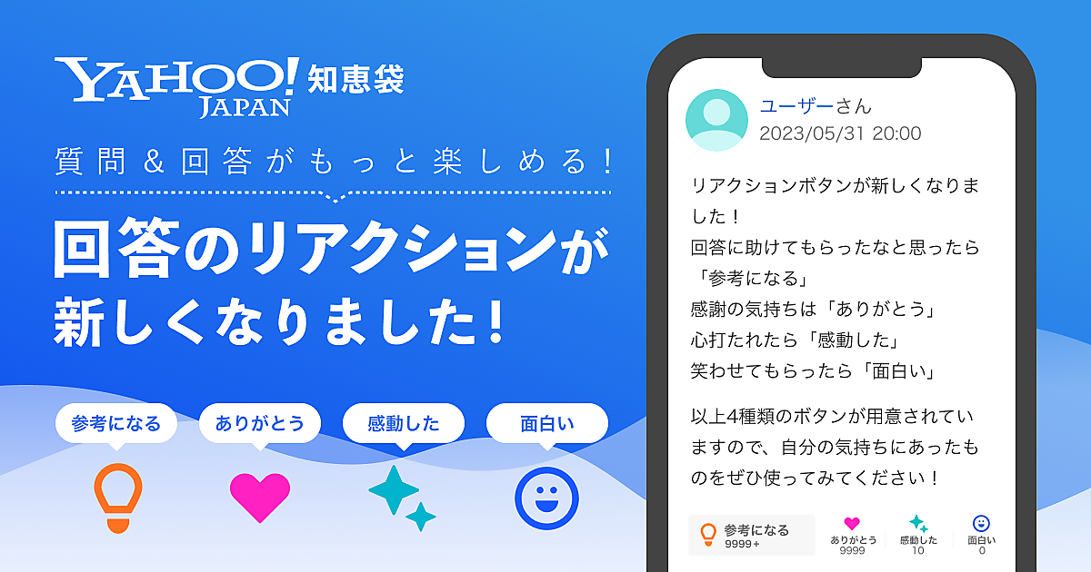 ヤフーは、運営する知恵共有サービス「Yahoo!知恵袋」で質問への回答に「参考になる」、「ありがとう」、「感動した」、「面白い」の4種類のボタンで感謝を表現できる「選べるリアクションボタン」の提供を始めた、と6月5日に発表した。質問者が回答者に対して感謝の気持ちを示しやすい仕組みを採用することで、回答者のモチベーション向上や、ユーザー同士のコミュニケーション促進を図る。