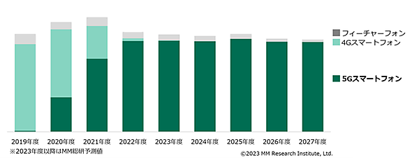 なお2022年度のスマートフォン出荷のうち、5G対応スマホは2902.9万台。前年から急拡大しスマホ全体の97.2%に達した。