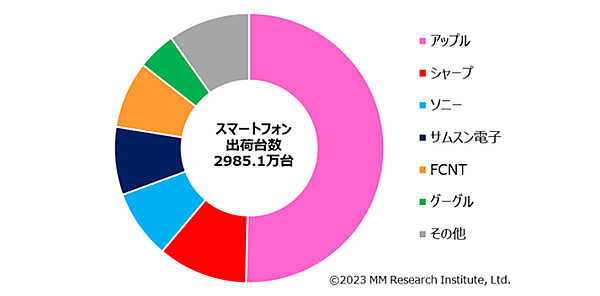 メーカー別に総出荷台数を見ると、シェア1位はアップル(50.4%)で12年連続で1位を獲得している。総出荷台数は1503.8万台で、6年ぶりに過半数を占めた。シェア2位はシャープで、以下FCNT、ソニー、サムスン電子が続いた。