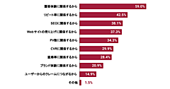 十分な成果が出ていると答えた担当者に対し、注力している取り組みを聞くと、1位は「マーケティング戦略の立案」36.8%、2位は「データ分析、レポーティング」35.9%、3位は「顧客データ、顧客リストの整備・更新」33.3%となった。