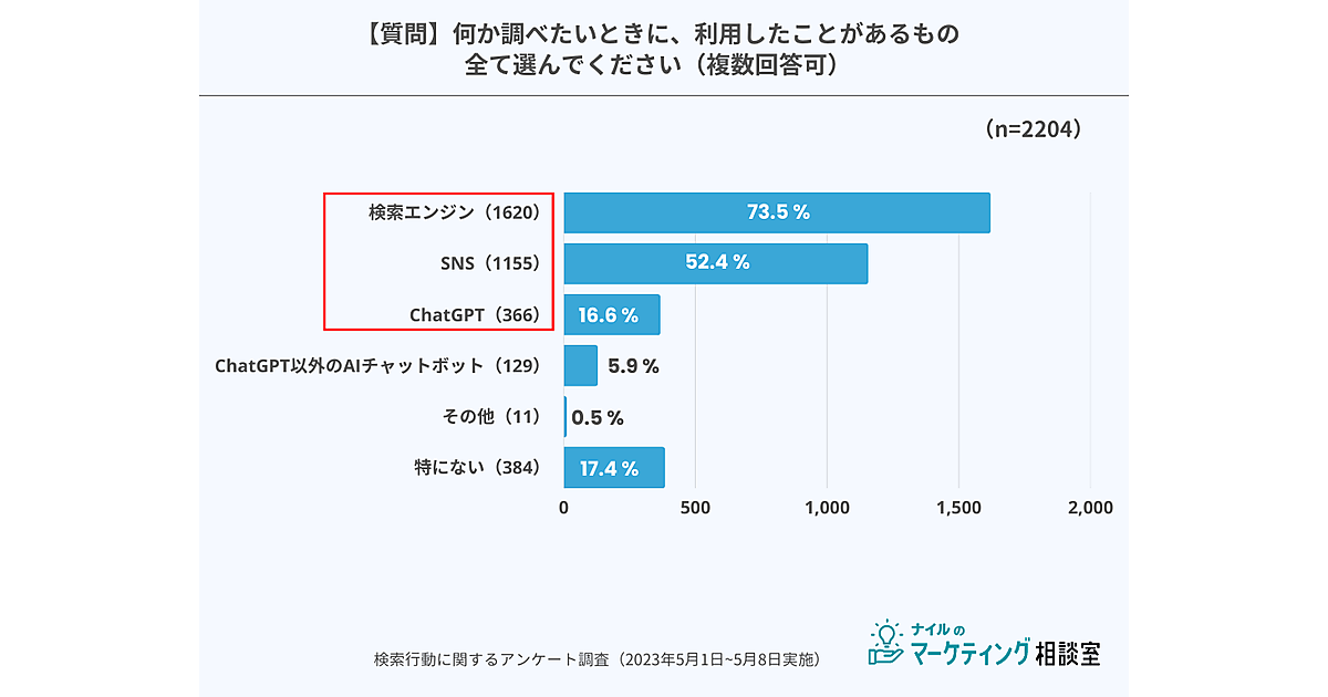ナイル(マーケティング相談室)は、「ChatGPTと検索エンジンのユーザー検索行動」に関する調査結果を発表した。20~40代の男女2,204人が回答している。