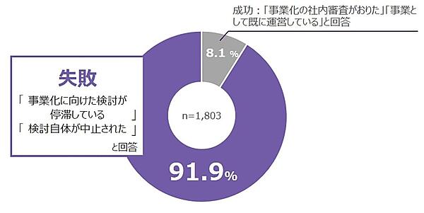 まずスクリーニング調査の段階で、「事業化の成否が判明した取り組み」(1,803名)のうち91.9%のメタバースビジネスが事業化に失敗していた。