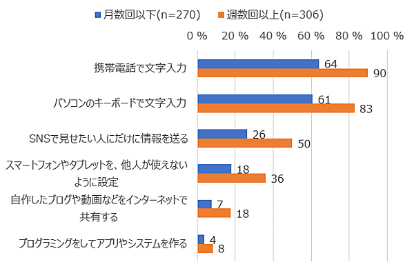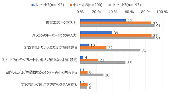 まず「携帯電話で文字入力」「パソコンのキーボードで文字入力」「SNSで見せたい人にだけ情報を送る」「スマホやタブレットを、他人が使えないように設定」「自作ブログ・動画などをインターネットで共有」「プログラミングでアプリやシステムを作る」といったICTスキルについて、実施可能かどうかを聞いた(子が回答)。