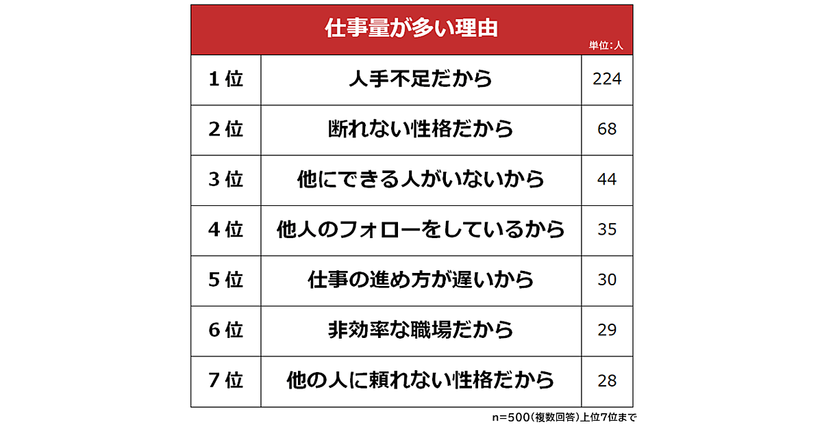 調査によると、仕事量が多い理由の1位は「人手不足だから」。人員不足により1人1人の負担が大きくなっている職場が多いことがわかった。2位は「断れない性格だから」、3位は「他にできる人がいないから」と続いた。