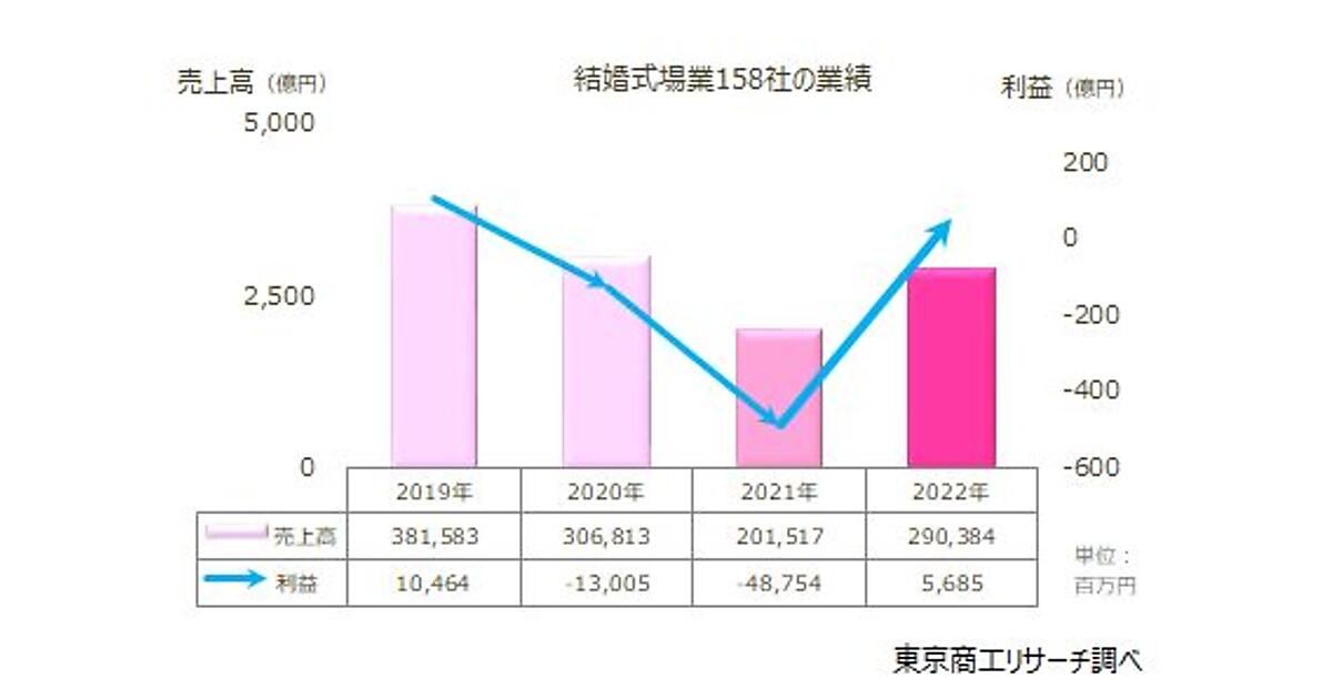東京商工リサーチは、「結婚式場業」の業績調査を実施した。全国の結婚式場運営会社(以下、結婚式場)158社を対象に、2022年(1~12月期)の業績を調べている。