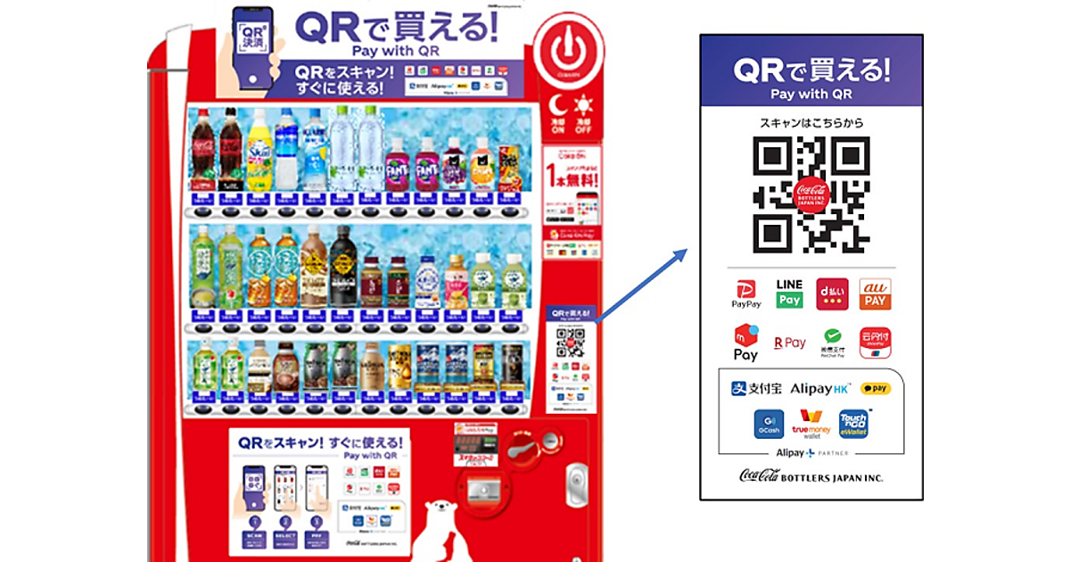 コカ・コーラボトラーズジャパンは、自動販売機で15種類以上の「QRコード決済」が利用できる「QR de決済」を6月7日から始めたと発表した。対象の自動販売機にQRコードシールを貼付し、職域や外国人旅行者の訪問が多い観光地を中心に、2023年内に約5万台の自動販売機でサービス提供を目指す。