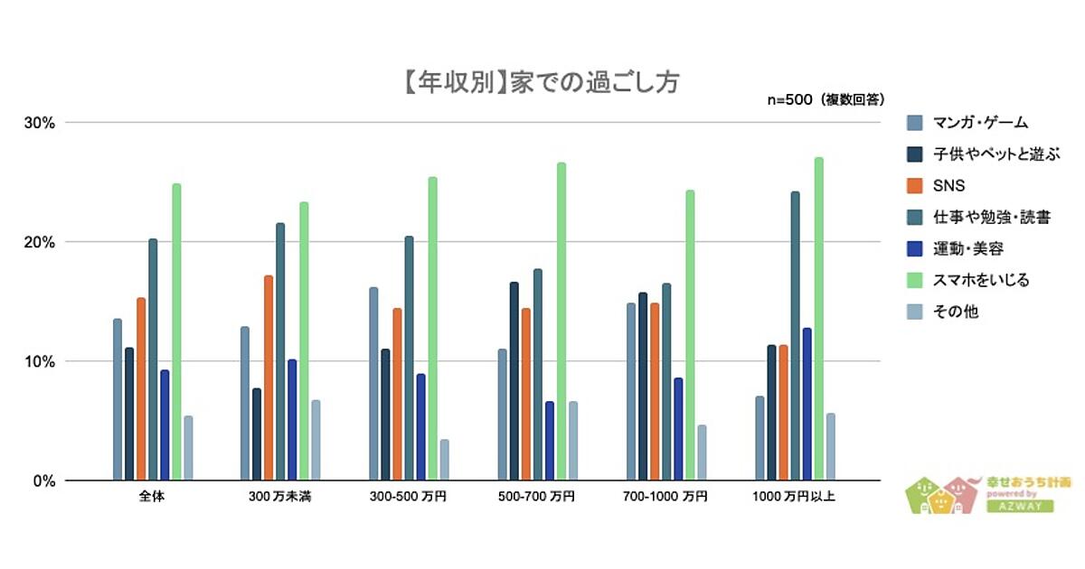 世帯収入別で見ると、1位・2位は同じだが、年収300万円未満の3位は「SNS」、300~500万円は「漫画・ゲーム」、500~1,000万円は「子供やペットと遊ぶ」、1,000万円以上は「運動・美容」とすべて異なる。高収入な人ほど自己研鑽に時間を費やしているようだ。なお「平日に家で自由にできる時間」は、1位が同率で「2時間未満」122人と「3時間未満」122人だった。