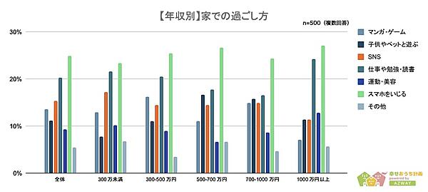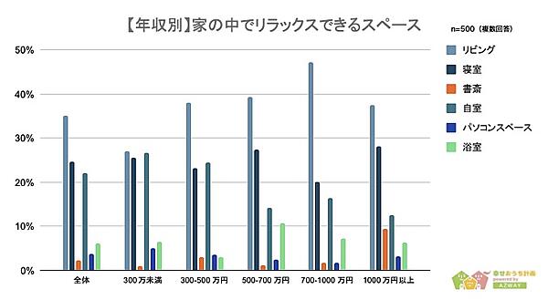 一方年収別では2位と3位が異なっており、年収500万円未満は2位「自分の部屋」、3位「寝室」なのに対し、年収500万円以上になると2位「寝室」、3位「自分の部屋」と入れ替わった。