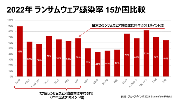 国別で見ると、ランサムウェアの感染率はすべての国で40%を超える。もっとも高いのはアメリカ89%だった。日本は前年の50%から増加し68%に達する。なお前年も調査対象だった7か国(日本、オーストラリア、アメリカ、フランス、ドイツ、スペイン、イギリス)の平均で見ると、2022年の感染率は69%で前年より1%増だった。