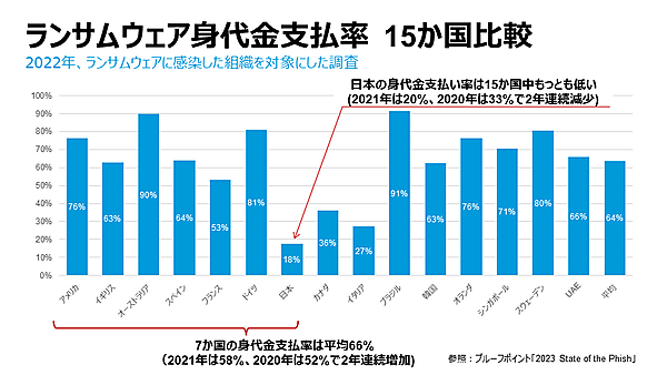 一方日本は15か国中最低で、少なくとも1回の身代金を支払った日本の組織はわずか18%にとどまった。世界的に支払率が高まっているが、日本は逆行傾向で、2020年33%、2021年20%と減少している。
