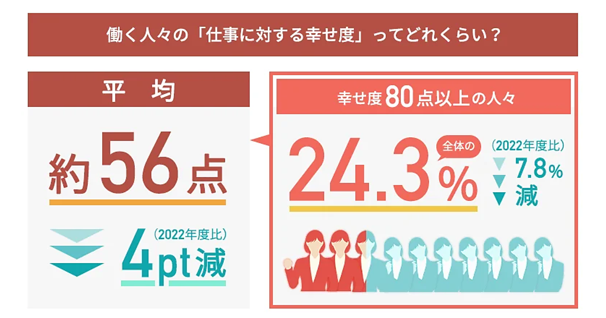まず、現在の「仕事に対する幸せ度」を100点満点で聞くと、平均は55.9点で、2022年度の調査よりも約4ポイント減となった。また、そのうち「幸せ度80点以上」と回答した人は24.3%で、同じく前回の調査よりも7.8ポイント減少していた。