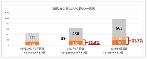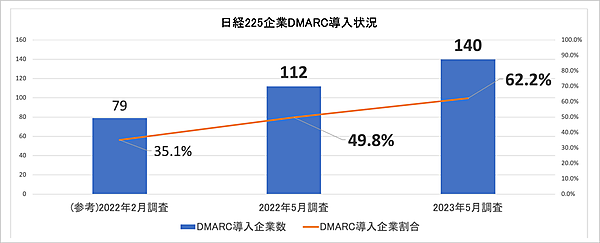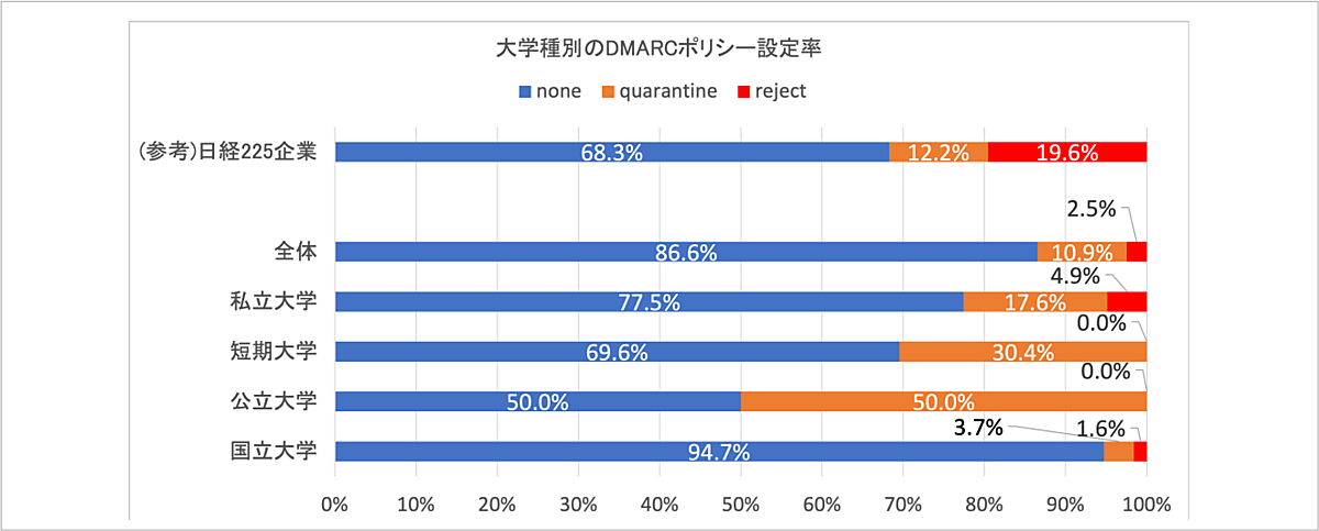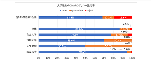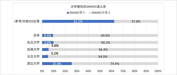 まず日経225企業のうち、DMARCを導入しているのは140社(62.2%)。前年同月の49.8%から12.4%増と、1年間で対策意識が高まったことがうかがえる。大学のDMARC導入率は全体平均では9.4%にとどまった。ただし国立大学に限ると、25.6%とかなり上昇する。