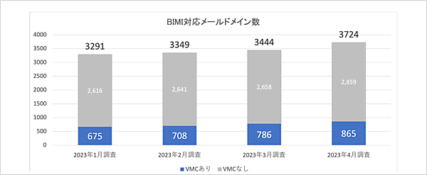 さらにbimigroup.orgによって策定された最新技術規格「BIMI(Brand Indicators for Message Identification)」の状況も調査。BIMIは、DMARCやVMC(認証マーク証明書)を利用することで、メール送信者の情報として認証済みのロゴを表示させる機能だ。Google、Appleなどが提供する主要メールサービスがBIMIに対応しているほか、2023年4月時点でTwoFiveは3,724ドメインでのBIMI対応を確認している。