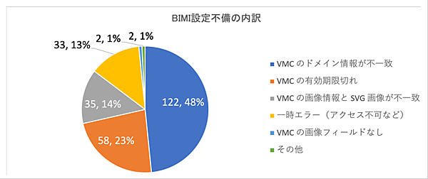 そのうち、VMCを設定していたのは865ドメイン(設定率:23.2%)だった。BIMIに対応している主要メールサービスがVMCを必須条件としていることから、今後この設定率は高まるものと予測される。一方でVMCを設定している865ドメイン中252ドメイン(29.1%)には、何らかの設定不備が確認されたとのこと。ドメイン名不一致、有効期限切れ、画像の不一致があったという。