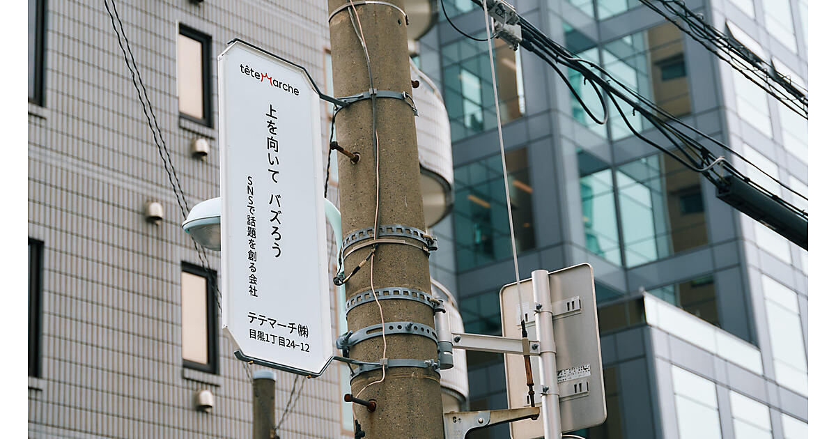 テテマーチの電柱広告は、権之助坂商店街を抜けた先の交差点の電柱と、商店街内の電柱の計2カ所に出した。同社のロゴマーク、社名、所在地とともに、交差点の電柱には「上を向いて バズろう SNSで話題を創る会社」、商店街内の電柱に「SNSを支える柱になりたい。」の文言を入れた。