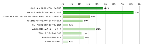 まず「大学内で見たことがある広告」を聞くと、「学食・売店・書店に貼られているポスター広告」83.1%が圧倒的多数で1位。「学食のトレイ(お盆)に貼られている広告」47.4%がそれに続いた。「キャンペーンブース」37.7%、「デジタルサイネージ」31.8%も多く、さまざまな広告が大学構内に入り込んでいるのがわかる。