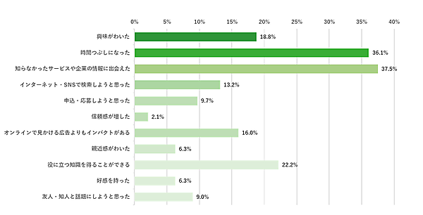 「大学内広告について感じたことのあるもの」では、「知らなかったサービスや企業の情報に出会えた」37.5%が最多の一方、「時間つぶしになった」36.1%も多い。大学構内という特定環境のため、“偶発的な初期接触”や“能動的な視認”が起きやすく、そうした効果を狙う広告主も多いと考えられる。