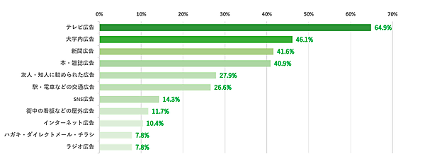 さらに「信頼できると感じる広告媒体(上位3つ)」を聞くと、「テレビ広告」64.9%が特に多く、「大学内広告」46.1%、「新聞広告」41.6%、「本・雑誌広告」40.9%がそれに続いた。テレビや新聞などのメディアは若者離れが囁かれることも多いが、広告の掲載媒体としては信頼されているようだ。一方SNS広告・インターネット広告は10%台にとどまった。