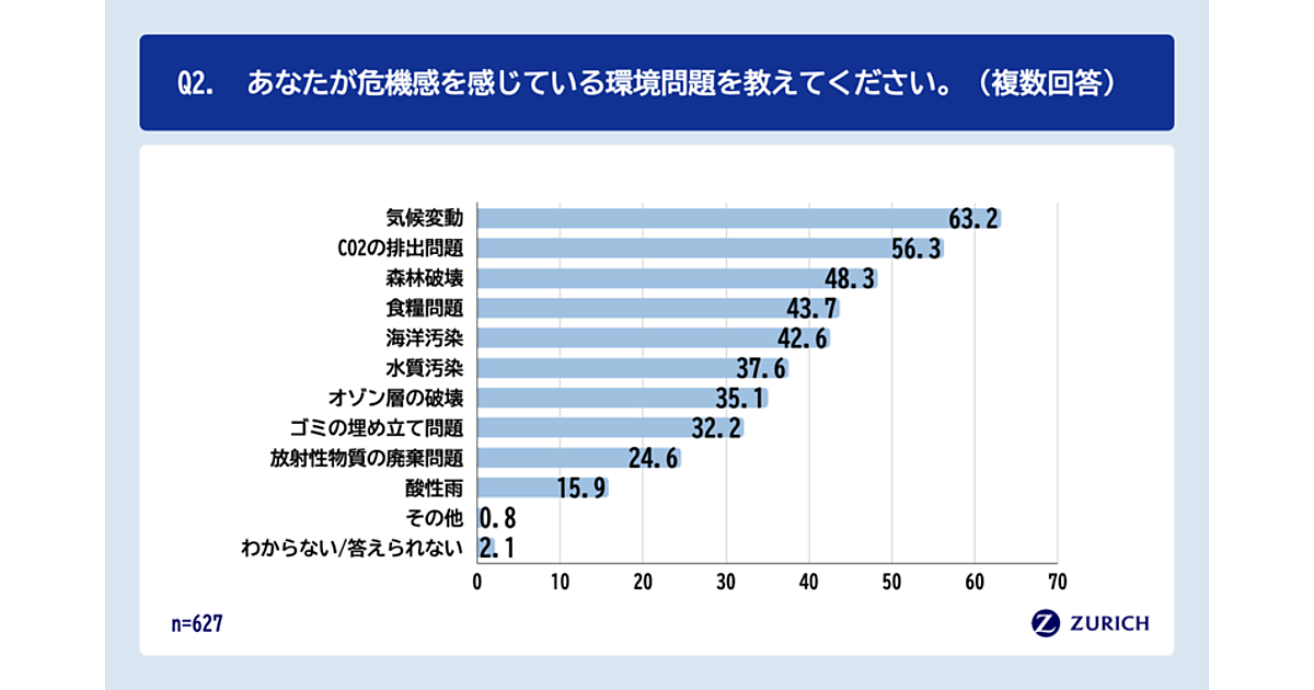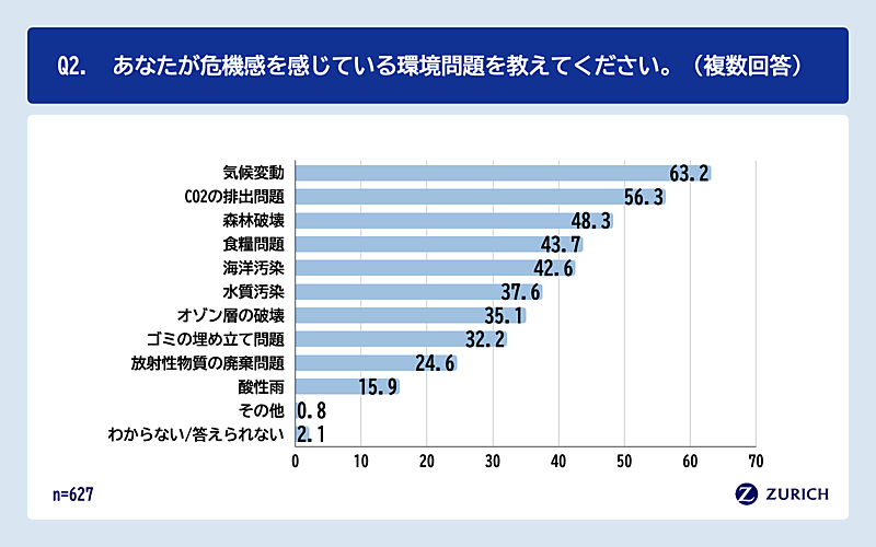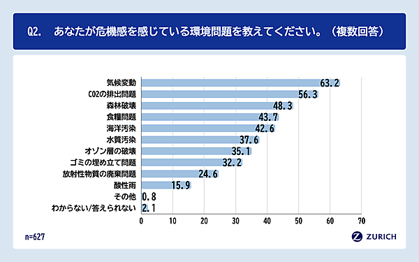 具体的に「危機感がある環境問題」を627人に聞くと、「気候変動」63.2%が最も多く、「CO2の排出問題」56.3%、「森林破壊」48.3%を上回った。