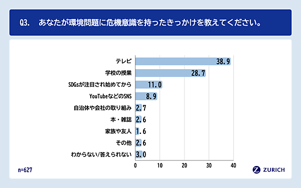 環境問題に危機意識を持ったきっかけ、「テレビ」「学校の授業」に「SDGs」が続く