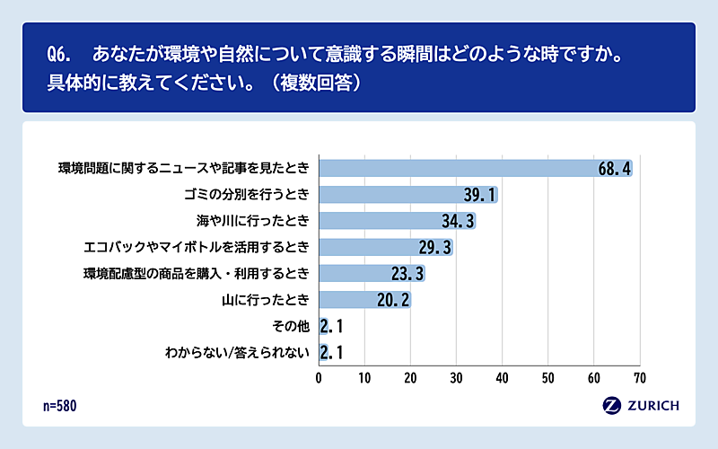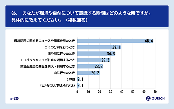 「日常生活の中で環境や自然について意識する瞬間はどの程度ありますか」と全体に聞くと、「非常にある」13.2%、「ややある」44.3%とこれも6割程度(580人)。「意識する瞬間は具体的にどのようなときか」を580人に聞くと、「環境問題に関するニュースや記事を見たとき」68.4%が特に多かったが、「ゴミの分別を行うとき」39.1%、「海や川に行ったとき」34.3%など、日常生活に根ざした答えも多かった。