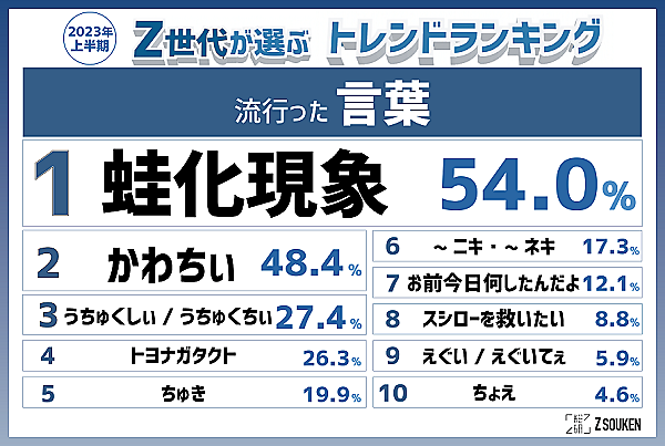 まず流行した言葉(フレーズ)は、「それな」「草」「知らんけど」といった斜に構えたフレーズが姿を消し、「かわちい」「うちゅくしぃ」「ちゅき」などの幼児っぽいフレーズが多くランクイン。そうした一方「蛙化現象」54.0%が1位となった。トップ10を見ると、ポジティブとネガティブが入り交じった状態だ。