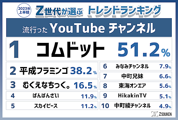 その他、流行ったYouTubeチャンネル1位は「コムドット」51.2%が前回に続き1位。一方で流行ったTikTokerは「なえなの」10.5%が3位に後退し、「MINAMI」21.2%、「桜」12.8%が上位に躍り出るなど、世代交代の気配がうかがえる。