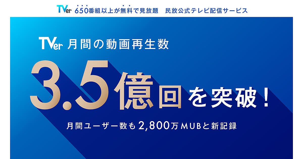 民放公式テレビ番組配信サービス「TVer(ティーバー)」を展開するTVerは、TVerサービスの5月の月間動画再生数が前年同月比約1.8倍の3億5877万回、月間ユーザー数が2800万MUB(月間ユニークブラウザ数)となり、過去最多を記録した、と6月15日発表した。4月期のドラマの動画再生数が好調で、特番を含むバラエティ番組の動画再生数も増加した。