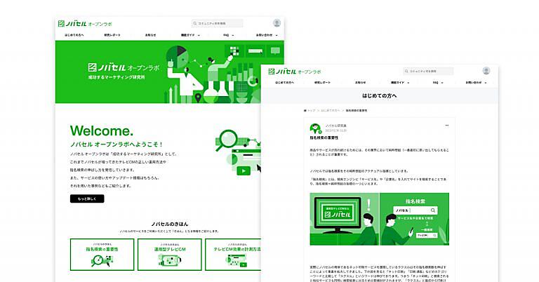 ノバセル オープンラボは、会員登録(無料)すると参加できるクローズドのポータルサイトで、テレビCMの運用方法や指名検索の伸ばし方を発信する。マーケティングについてのノウハウ、各種ツールの使用法、アップデート情報、事例などの研究レポートを掲載し、レポートに対するコメントや研究内容のリクエストを通じて会員と双方向で交流する。